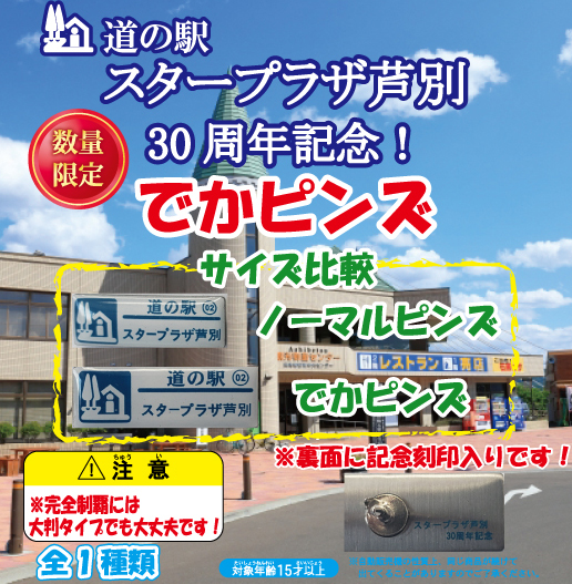 トップページ > 道の駅 ガチャピンズラリー お知らせ一覧 > 【北海道版】道の駅 スタープラザ芦別 30周年を記念し、 4/22(土)〜数量限定にて30周年記念ピンズを販売致します!